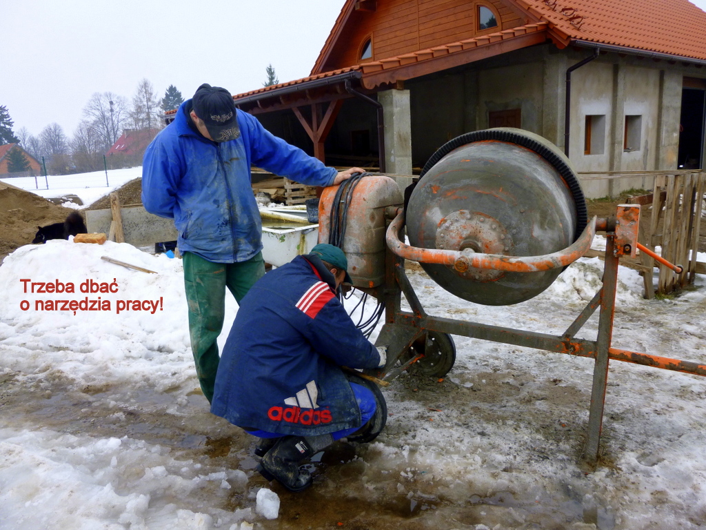 Wokoło jeszcze pełno śniegu, ale pomagamy wiośnie i rozpoczynamy pierwsze prace budowlane! Wystarczyło odśnieżyć fragment fundamentów, aby przygotować wykop i szalunki, a potem zabetonować słupy pod przyszłe podcienia budynku. Chłopcy nie mogli się wręcz doczekać, aby wyruszyć na tę najbardziej „męską” pracę.
