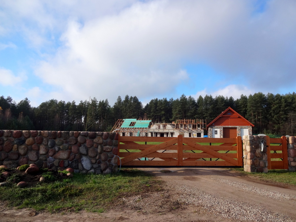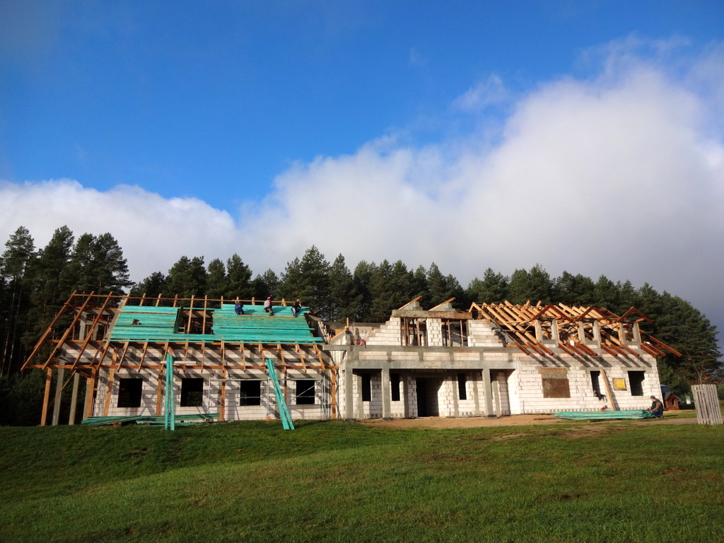 Na dachu pojawiły się pierwsze deski. Trochę dziwnie wygląda ich turkusowy kolor, ale to przecież tylko kolor impregnatu. Cały czas malujemy lazurą deski, które będą stanowiły podsufitkę dachu.