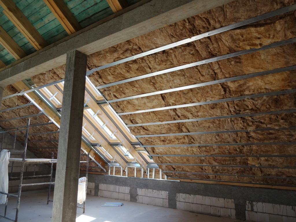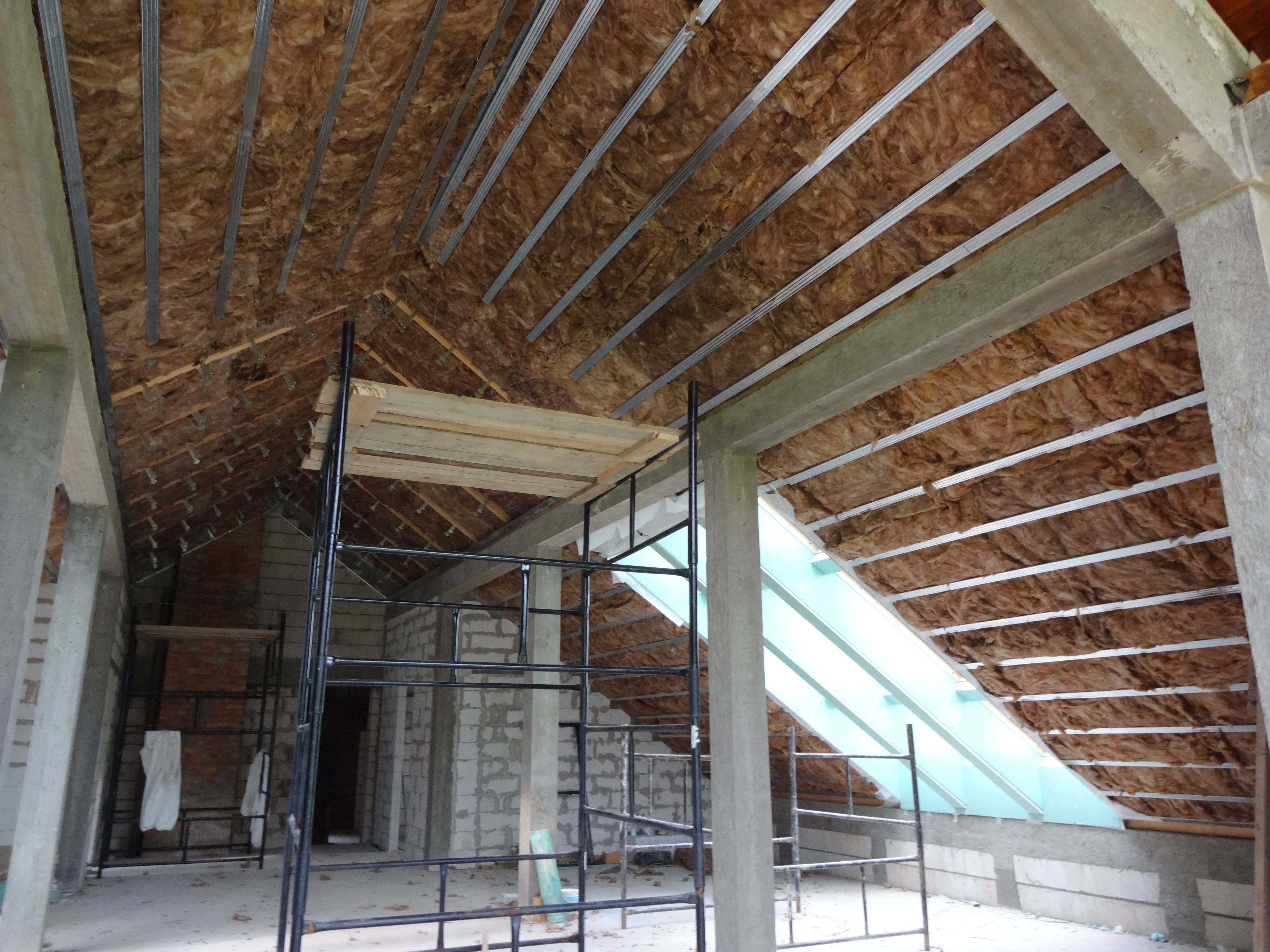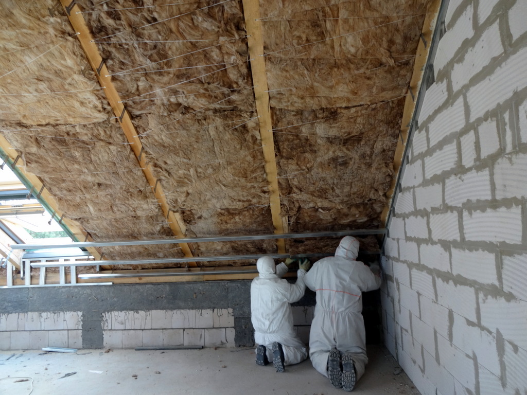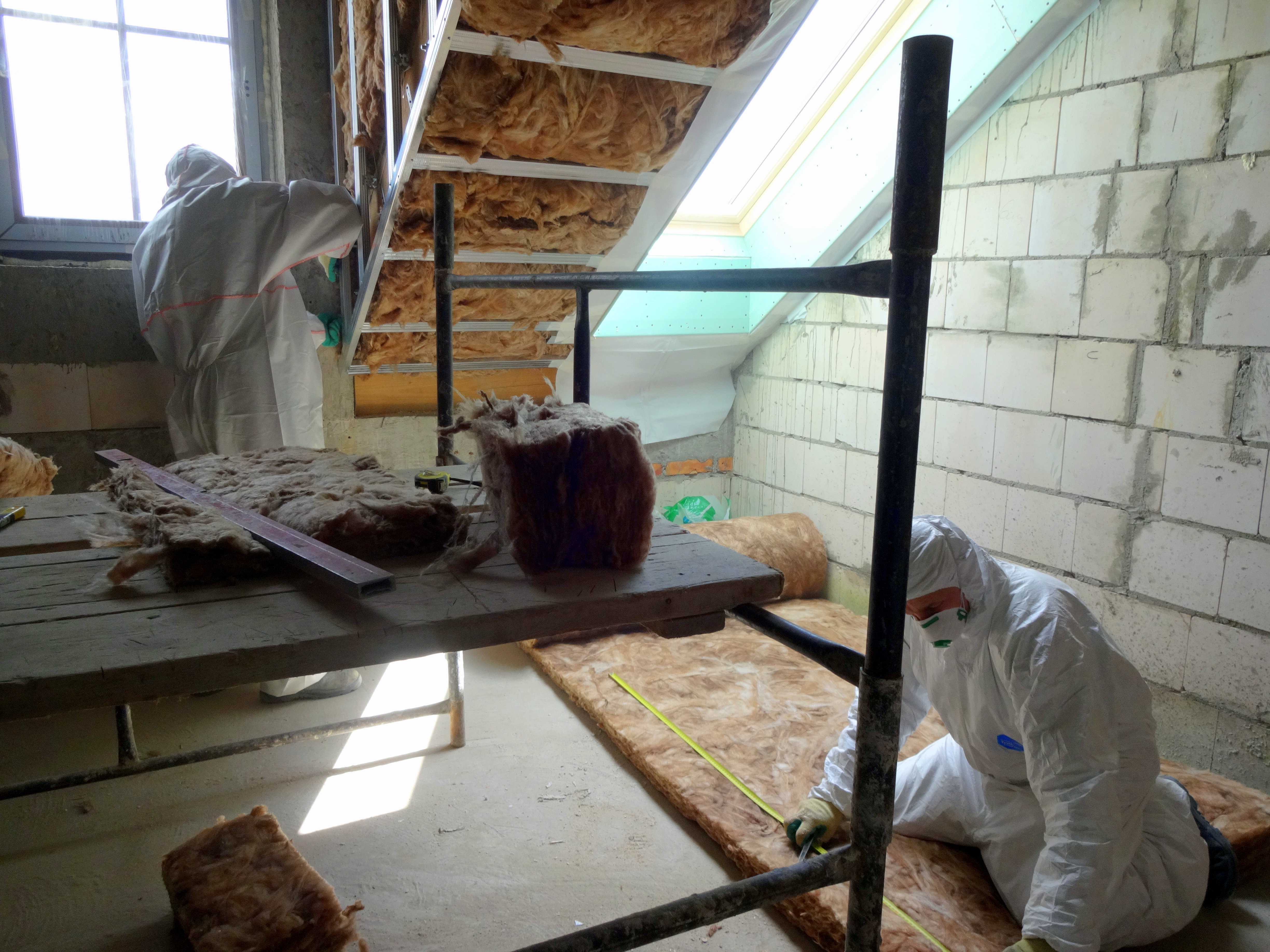 Cały czas trwają prace przy starannym docieplaniu budynku dwiema 15-centrymetrowymi warstwami wełny mineralnej. To trudna praca wymagająca dokładnego rozmieszczenia systemu mocowań i profili, a następnie zamocowaniu warstw wełny. Przed jej zapyleniem trzeba się chronić specjalnym strojem.