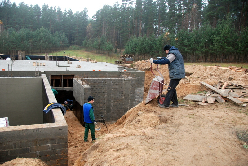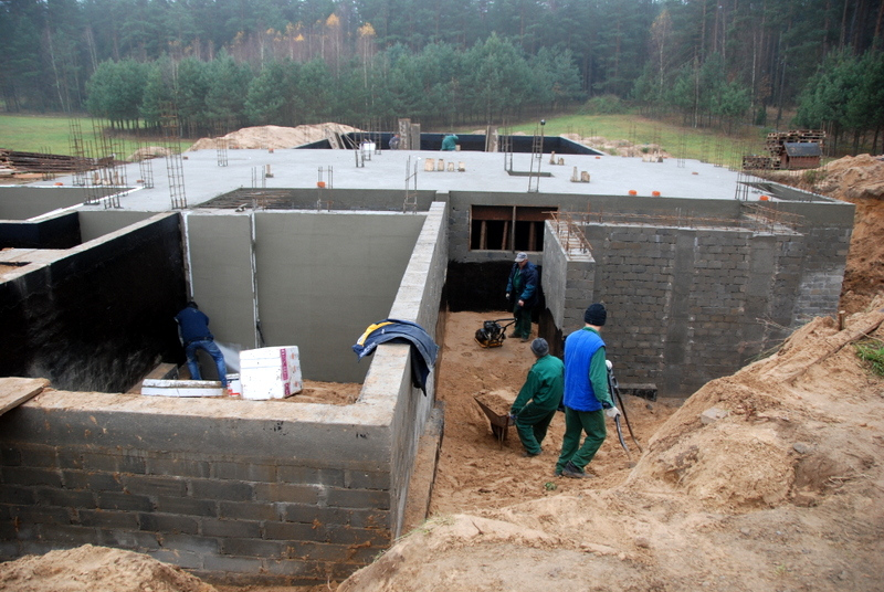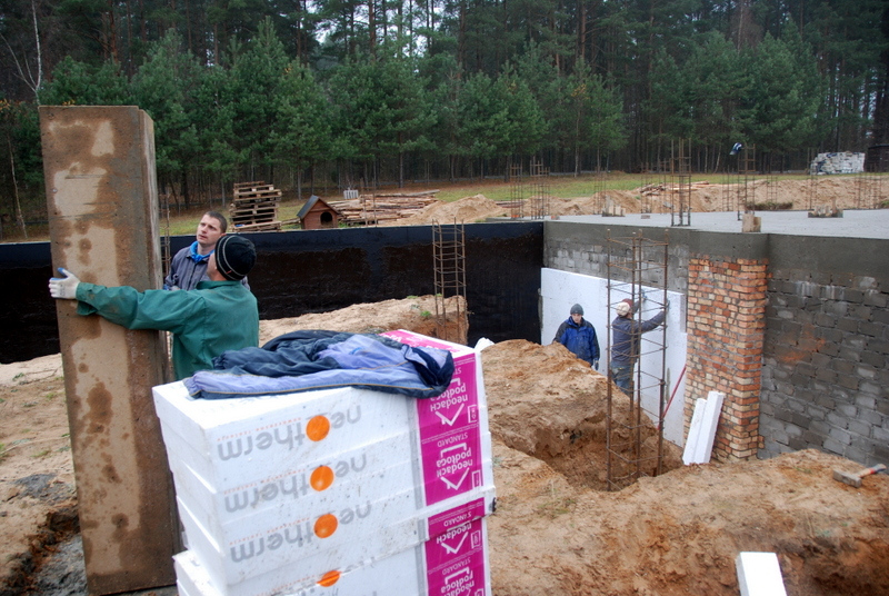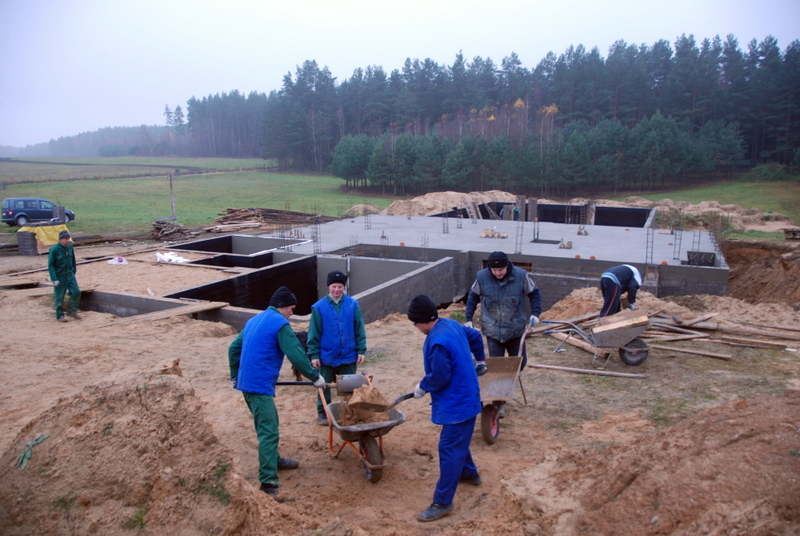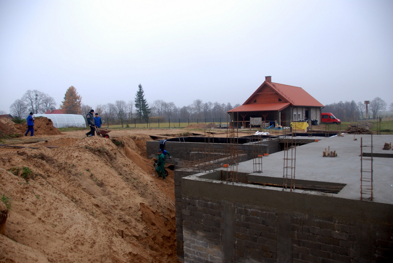 Podpiwniczona część budynku jest już nakryta stropem. W części niepodpiwniczonej trzeba jeszcze przygotować żelbetonowe słupy konstrukcyjne, a całość fundamentów odpowiednio zaizolować i docieplić styropianem. Jeśli uda się to zrobić przed zimą to będzie można zsypać wykopy w środku i wokół budynku. Mobilizujemy wszystkie siły.