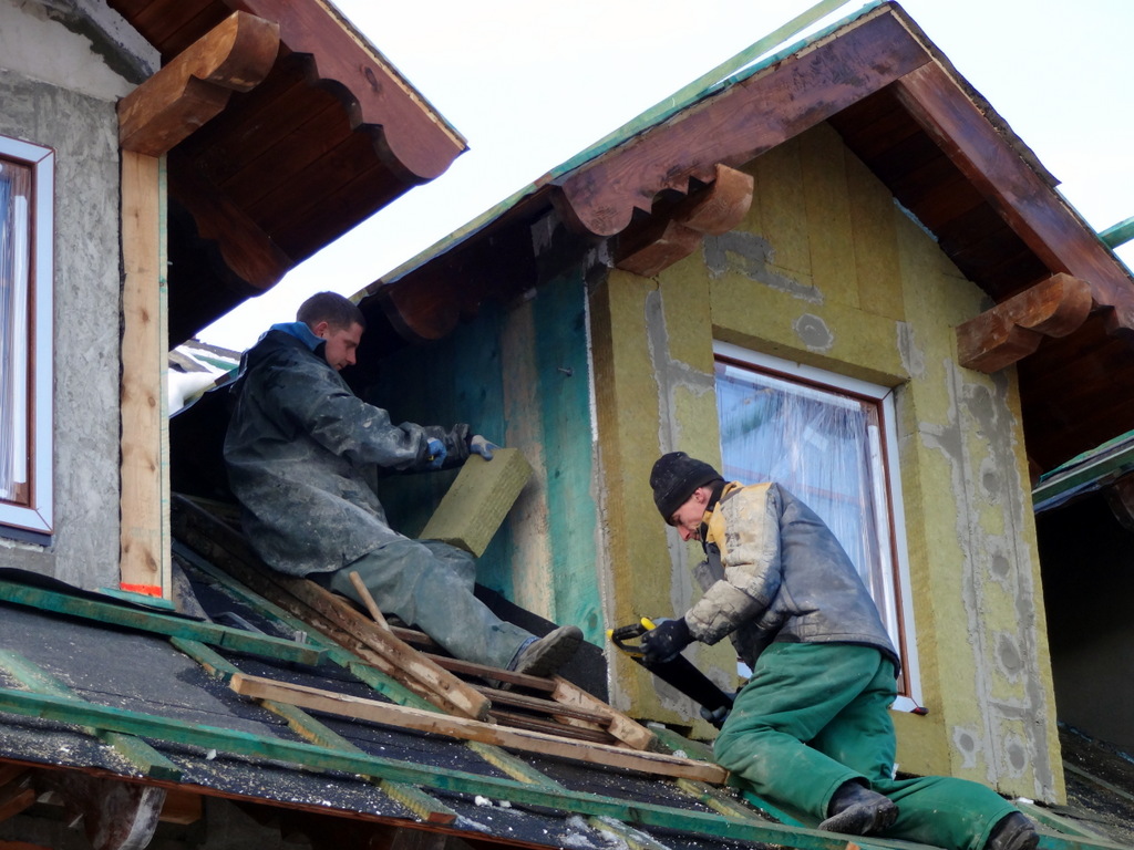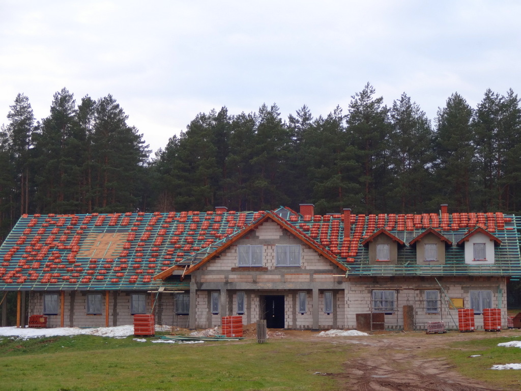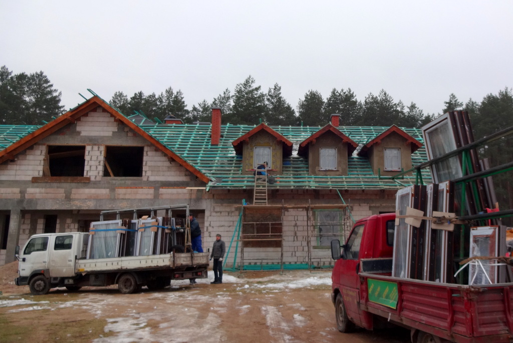 Dziękujemy Bogu za każdy ciepły grudniowy dzień! Zima nas postraszyła i na razie odeszła. Dodatnie temperatury pozwoliły na zakończenie prac murarskich. Można uznać, że budynek w stanie surowym został w tym roku wykonany! Walczymy jeszcze o dach. Dziś dachówki ceramiczne zostały sprawnie przetransportowane na górę. Jednocześnie docieplane są i tynkowane lukarny, aby można je było „na czysto” wykończyć dachówką. Dziś przyjechały również i zostały osadzone okna!