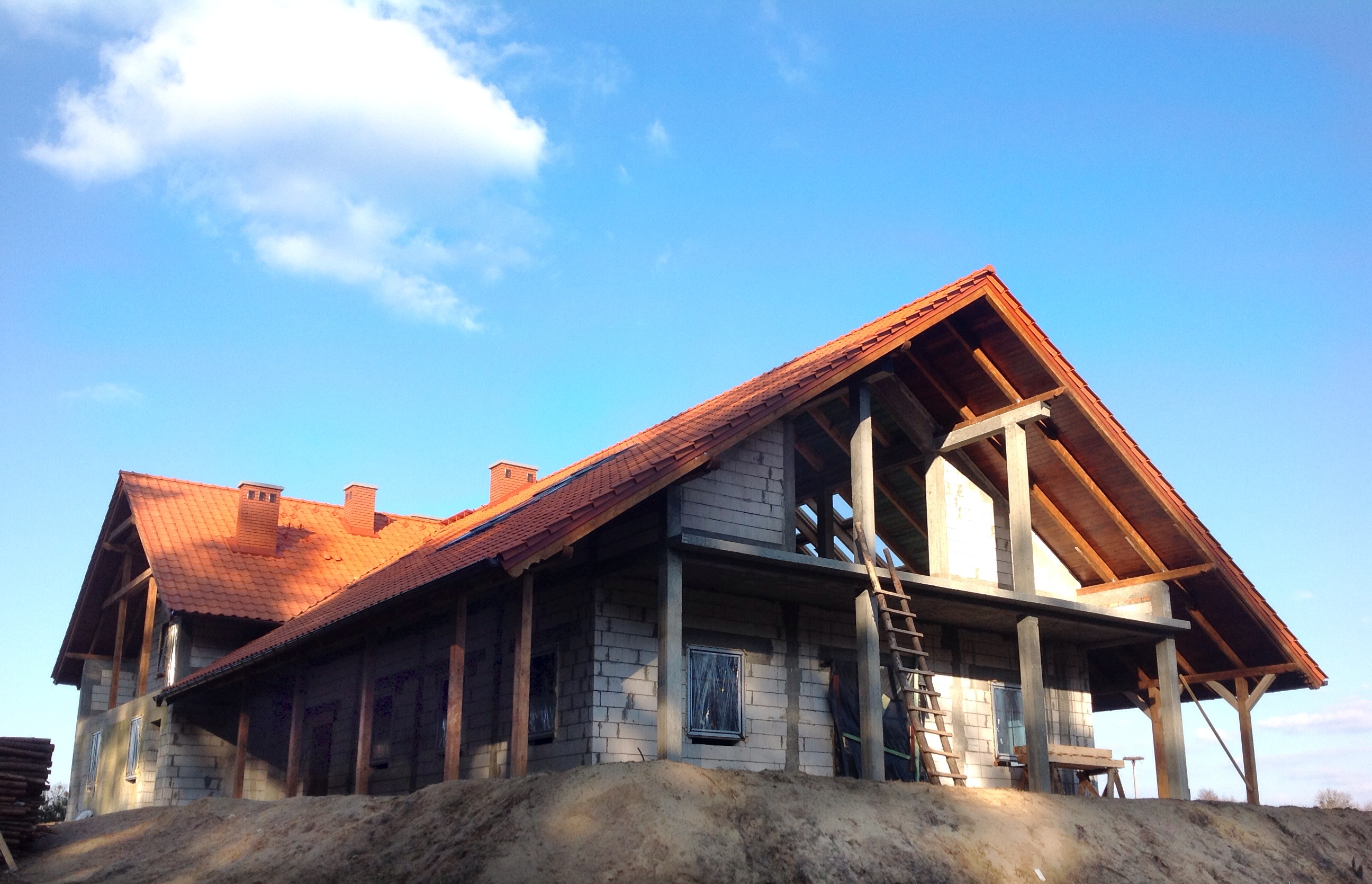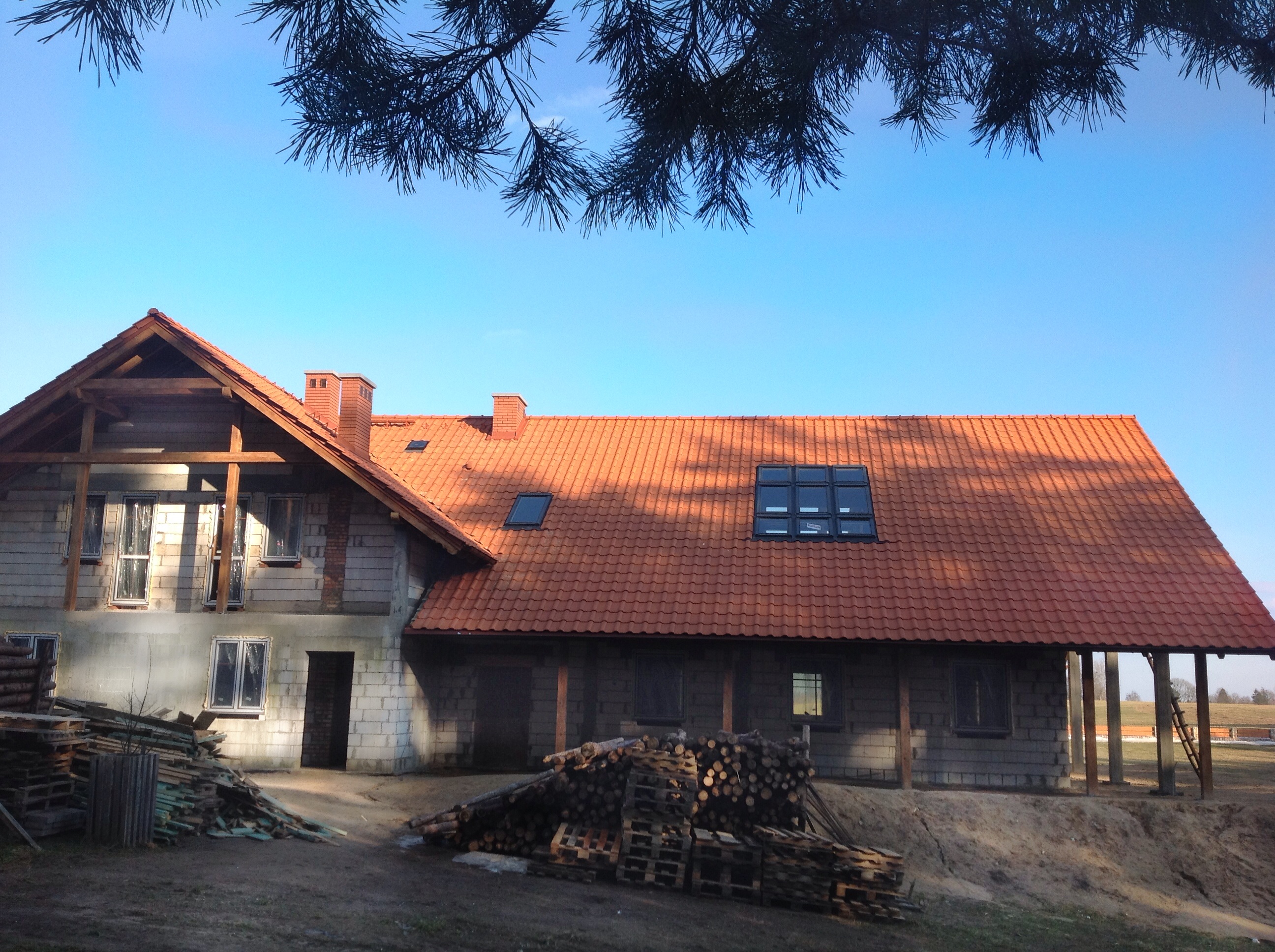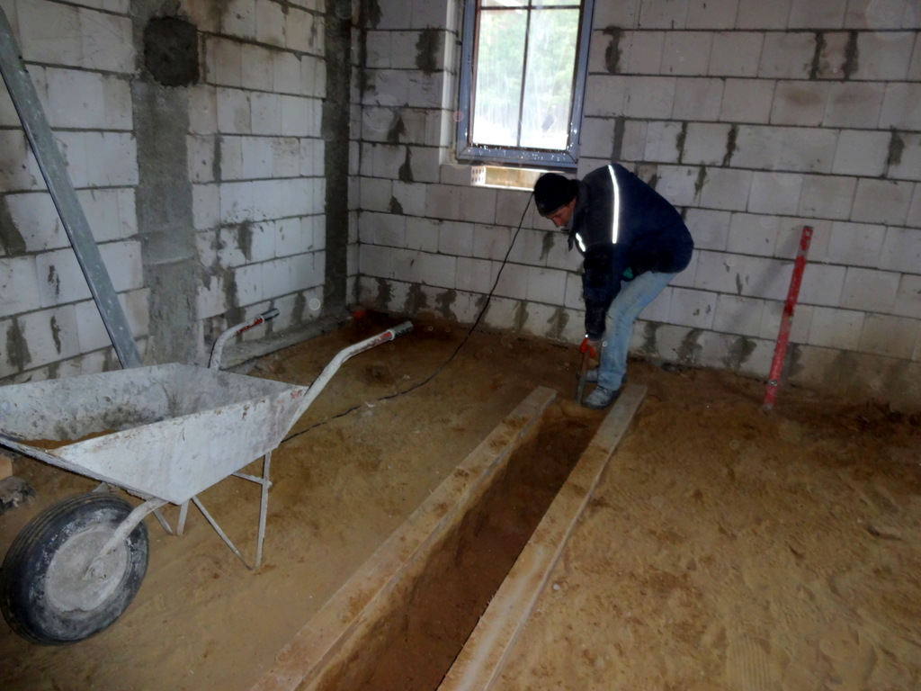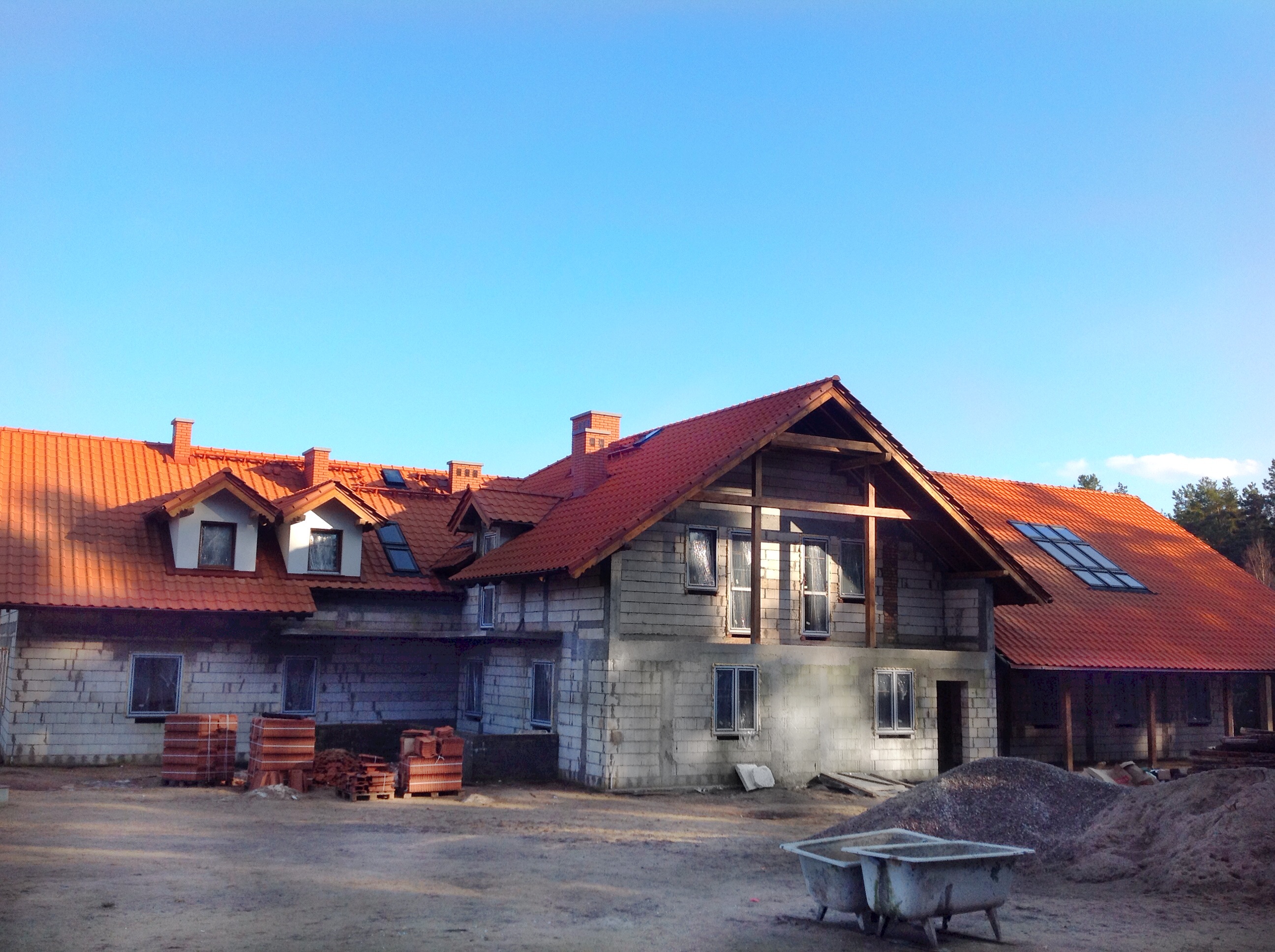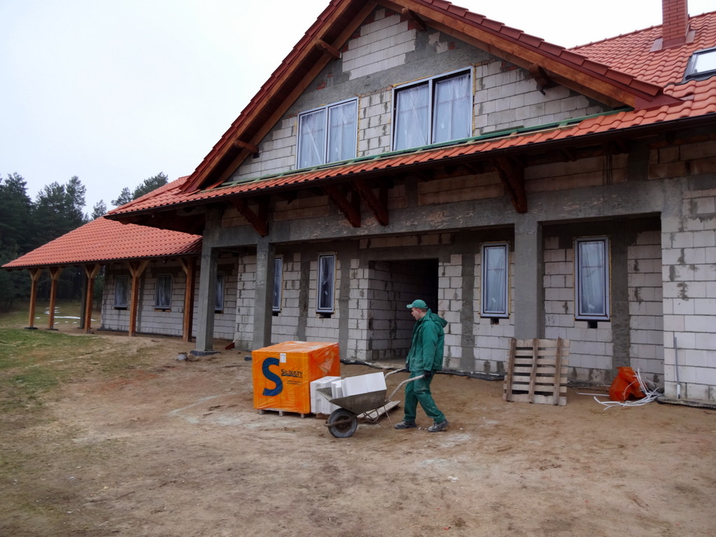 Wyjątkowo łaskawa zima z wiosennymi temperaturami pozwala już wrócić na budowę. Dekarze zakończyli prace na dachu. Można rozpocząć prace wewnątrz budynku. Na początek podwaliny pod ścianki działowe.