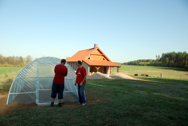 Co by to było za gospodarstwo bez ogródka warzywnego? Nasza farma nie ma jeszcze ogrodzenia. Swobodnie przechadzają się po nim zwierzęta z lasu, którym jesteśmy otoczeni. Postanowiliśmy więc tymczasem uprawiać trochę warzyw pod tunelem foliowym. Mamy już zapas czarnoziemu, a dziś, na dobry początek długiego weekendu, powstała konstrukcja tunelu. Mamy nadzieję, że w ciągu najbliższego tygodnia posiejemy i posadzimy nasze ekologiczne warzywa, tak aby rosły razem z domem. Otrzymaliśmy właśnie pozwolenie na budowę II etapu zabudowy zagrodowej, czyli domu mieszkalnego!