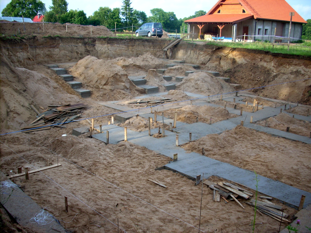 Lipiec 2012 był miesiącem żmudnego wytyczania fundamentów domu i wykonywania podstaw pod ławy fundamentowe. Grunt, na którym ma stanąć dom jest piaszczysty, stąd konieczność wylania z chudego betonu solidnych podstaw, na których oprze się zbrojenie i ławy (w końcu wiadomo jak to jest z „budowaniem na piasku”…). Zaskakująco wyglądają „schodki do piwnicy”. Po prostu tylko centralna część domu będzie podpiwniczona, a fundamenty muszą się łączyć i w ten sposób trzeba było – zgodnie z projektem – zniwelować poziomy. Praca odbywała się w trudnych warunkach atmosferycznych. Ulewne deszcze powodowały osuwanie się wykopu. Na szczęście pomógł nasz ciągnik i wytrwałość pracowników, którzy teraz zasłużyli na krótki urlop.