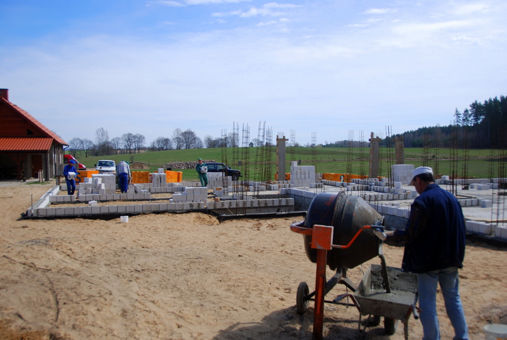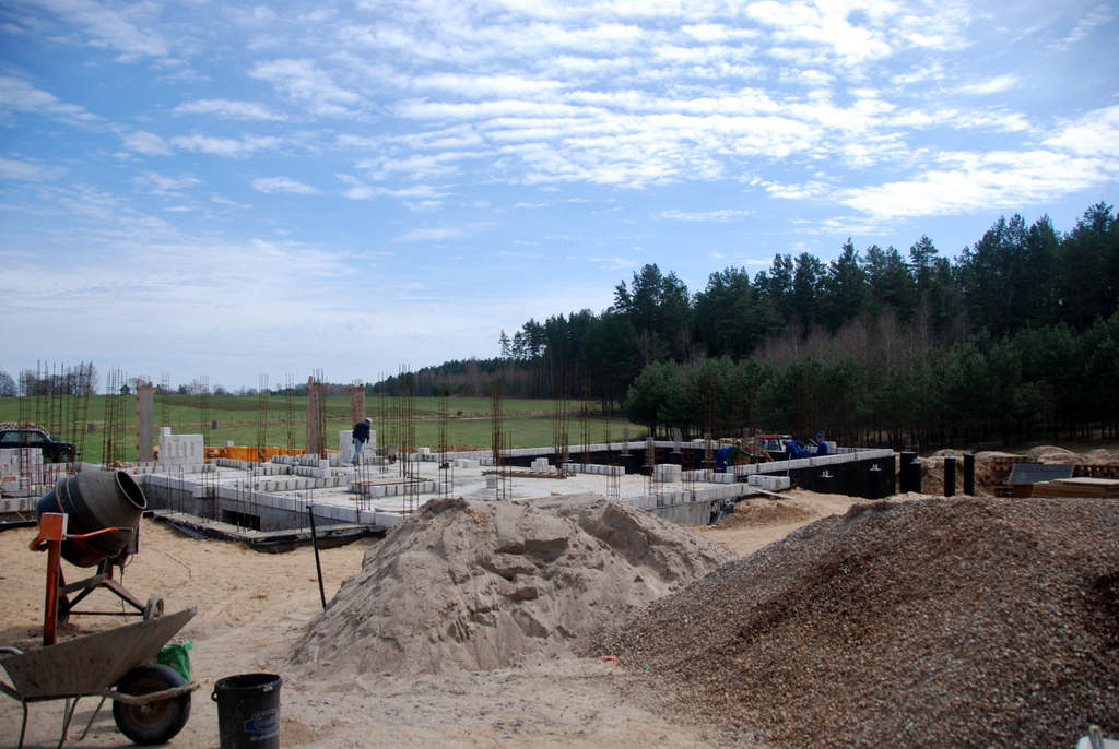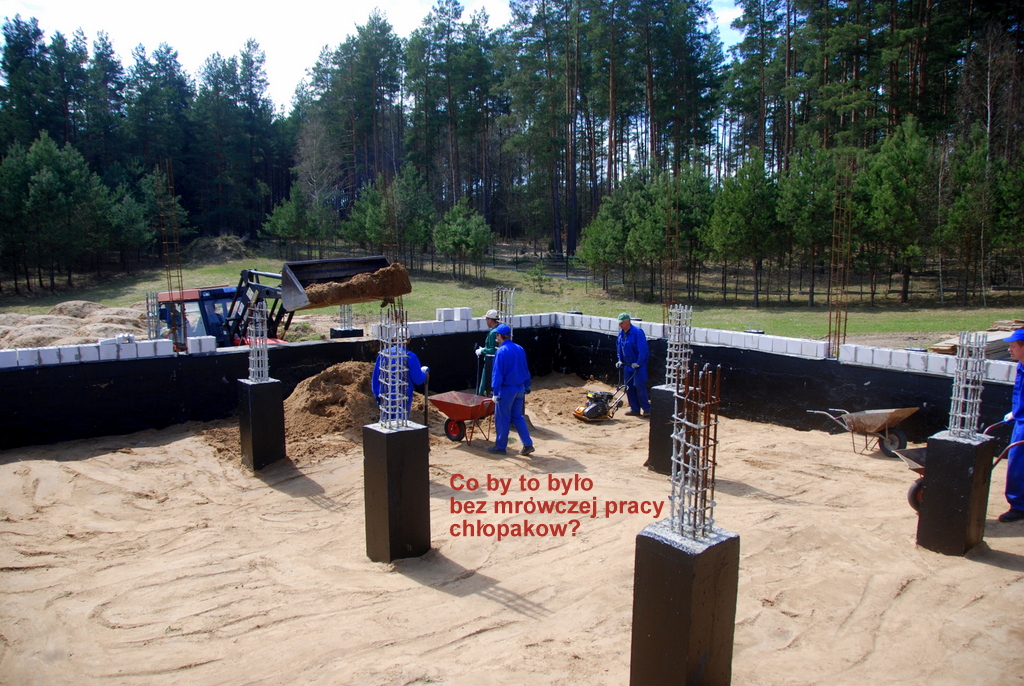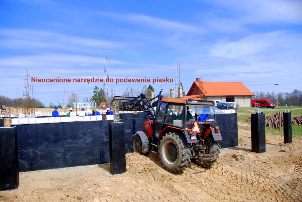 Nie ma to jak dobry sprzęt i nasi chłopcy w akcji. Dzięki sprawnemu nasypywaniu pisaku do środka fundamentów praca przy zasypywaniu ostatniego ich fragmentu – pod przyszłą „salą kominkową” – szła bardzo sprawnie. Oczywiście tylko dlatego, że wcześniej przygotowano wszystkie potrzebne elementy, takie jak: słupy żelbetowe, izolacja, bednarka. Piwnice są już rozszalowane. Trwa murowanie ścian.