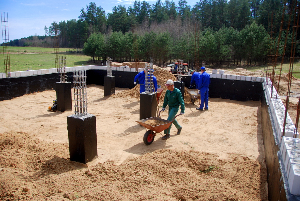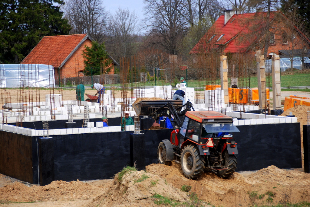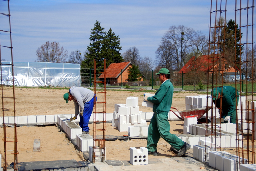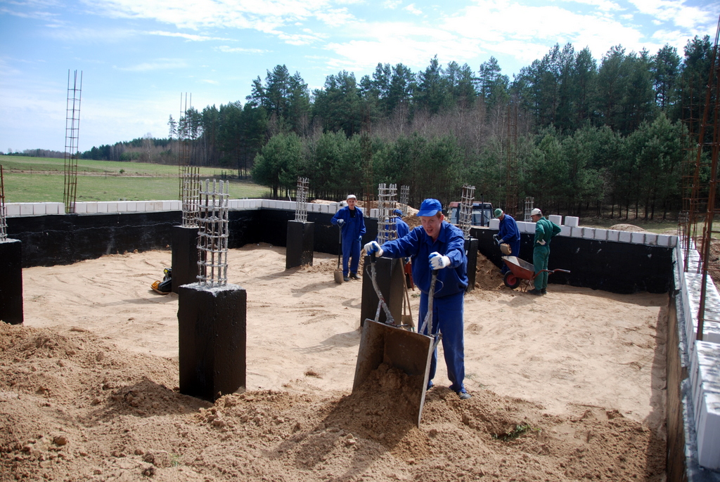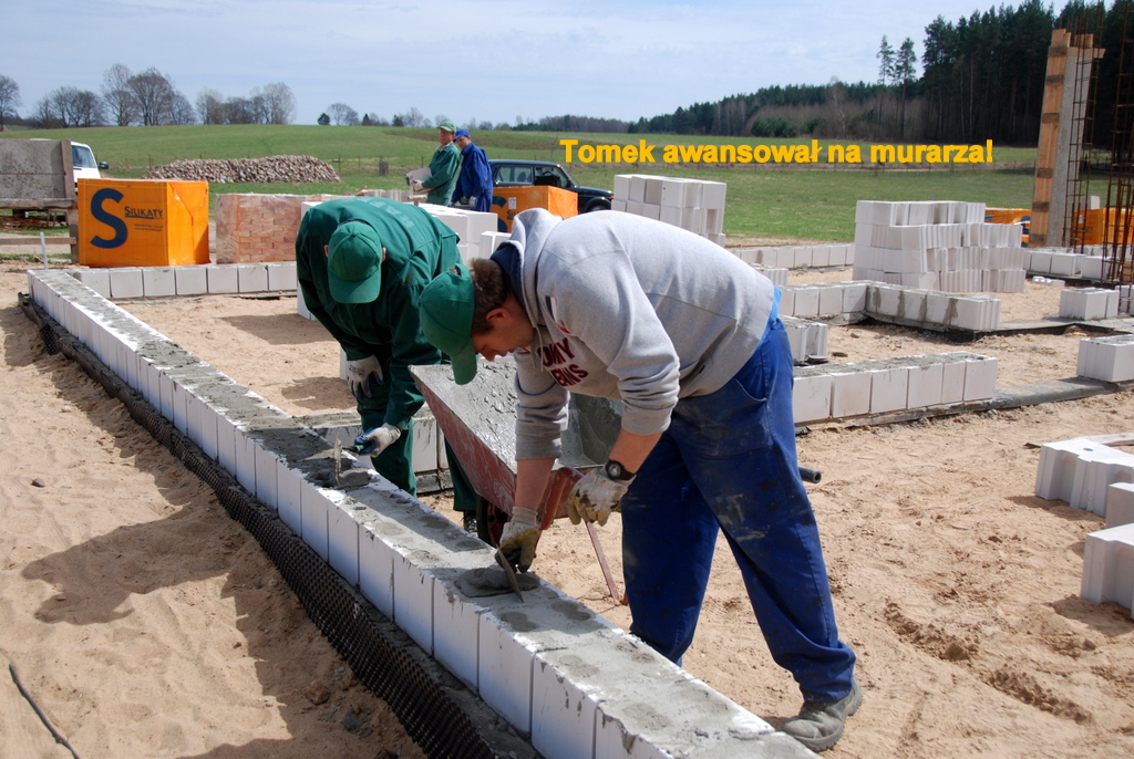 Nie ma to jak dobry sprzęt i nasi chłopcy w akcji. Dzięki sprawnemu nasypywaniu pisaku do środka fundamentów praca przy zasypywaniu ostatniego ich fragmentu – pod przyszłą „salą kominkową” – szła bardzo sprawnie. Oczywiście tylko dlatego, że wcześniej przygotowano wszystkie potrzebne elementy, takie jak: słupy żelbetowe, izolacja, bednarka. Piwnice są już rozszalowane. Trwa murowanie ścian.