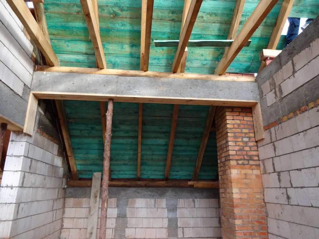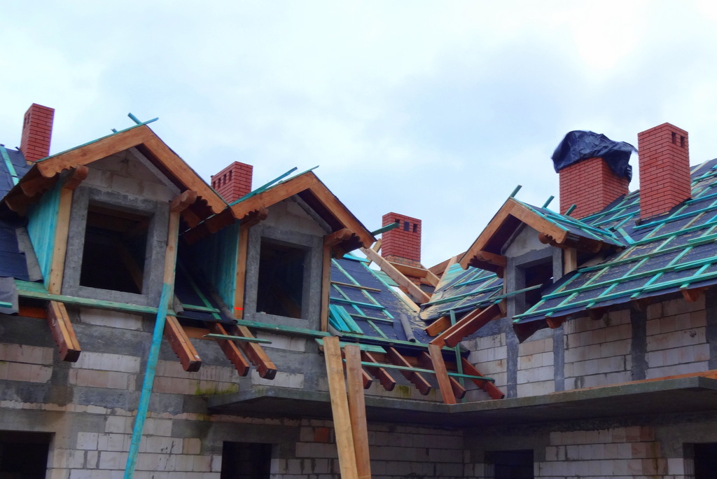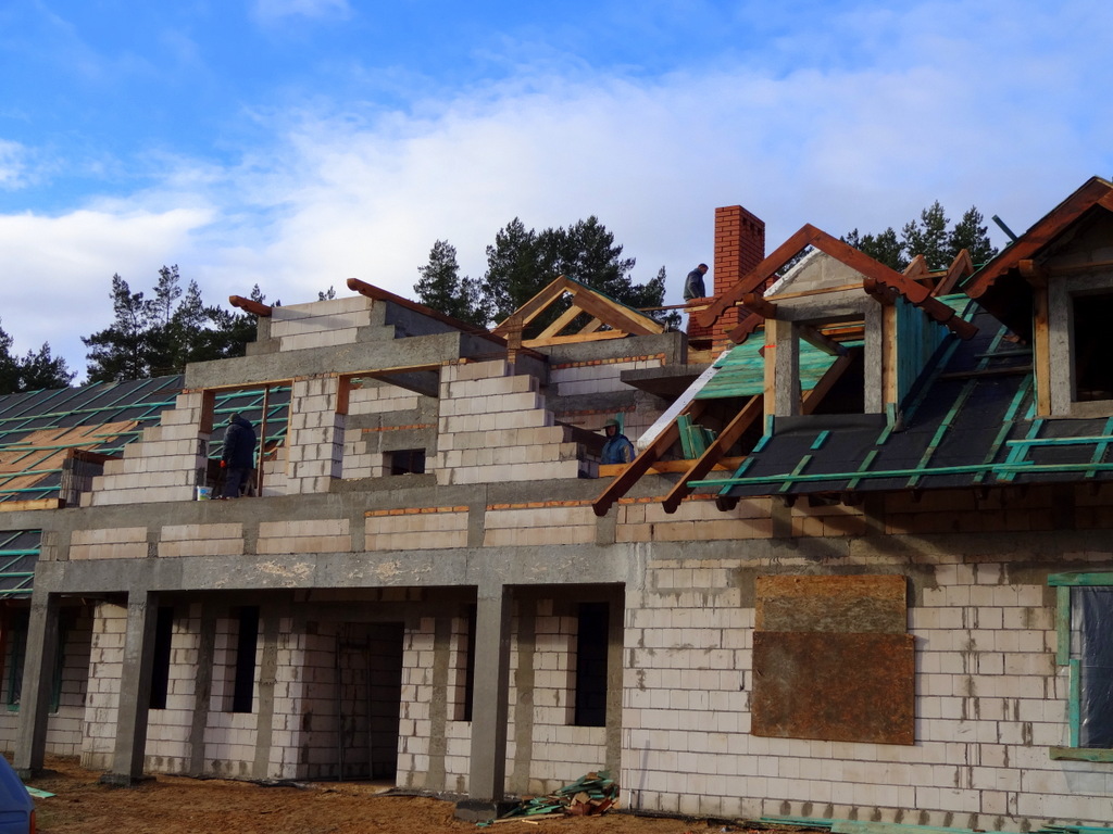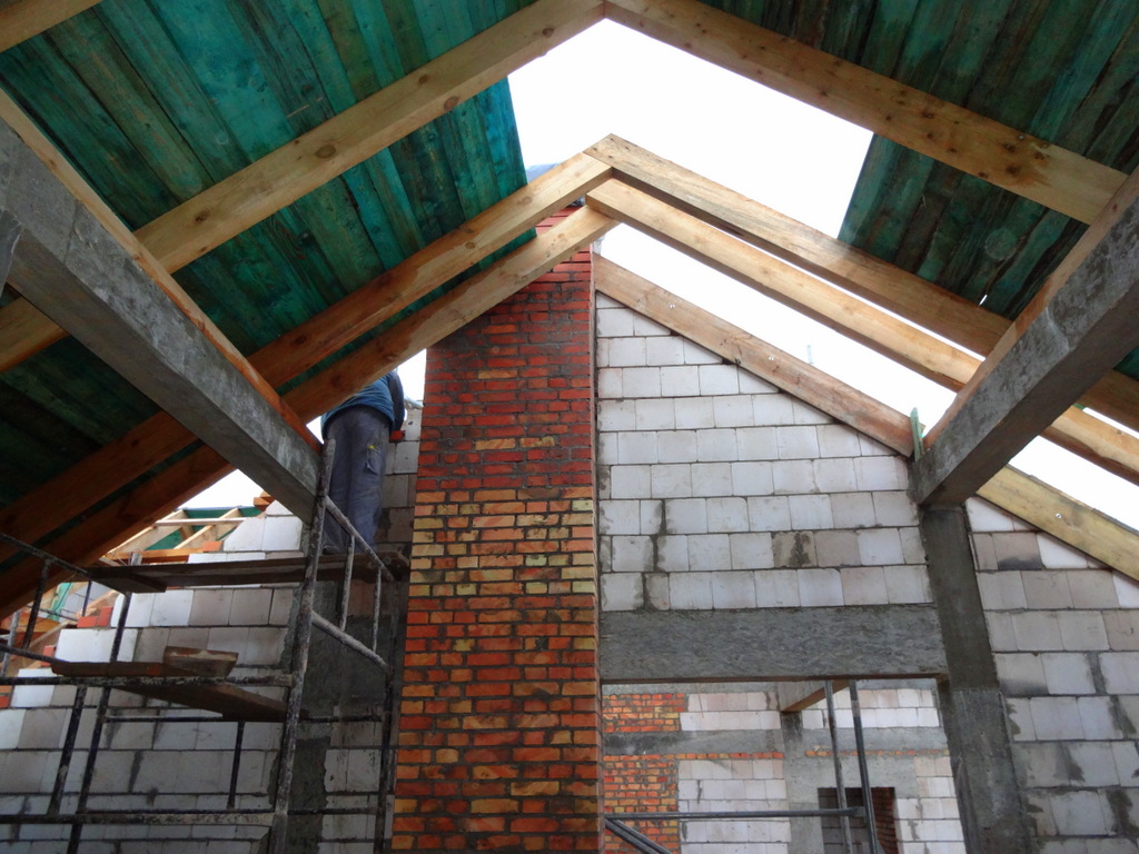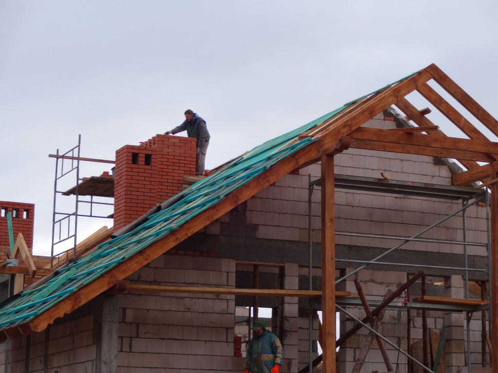 Dachu nie da się wykonać dopóki wszystkie kominy, które wychodzą nad jego powierzchnię nie zostaną wykończone. Cegła po cegle wznoszą się mozolnie. Trwa wyścig z czasem, bo zima za pasem. Temperatury są bliskie zera, ale nasze dzielne siostry i panie ciągle jeszcze malują lazurą podsufitkę dachu. Korzystamy przy tym z gazowych nagrzewnic.