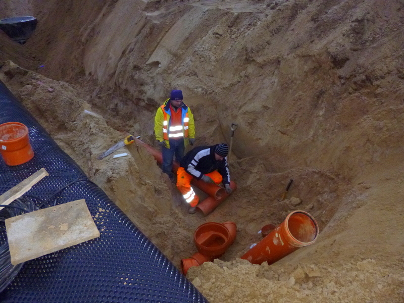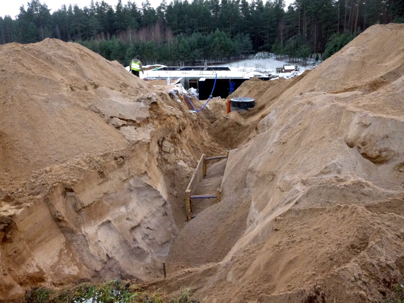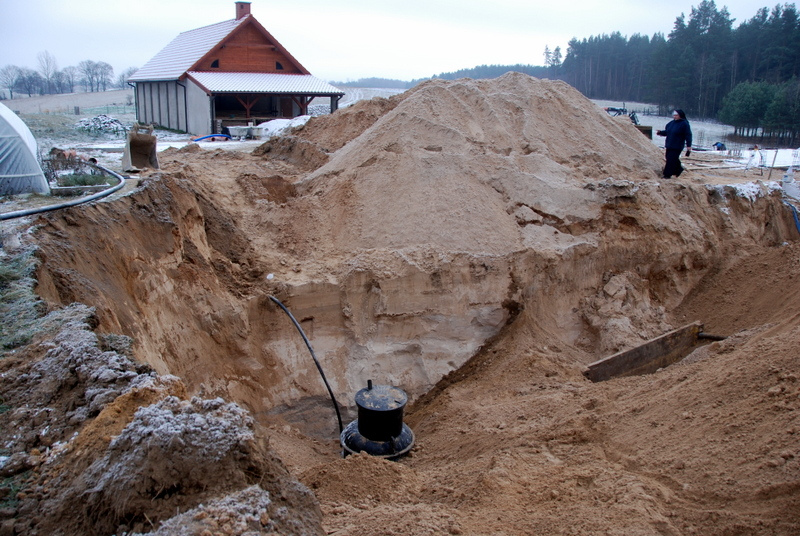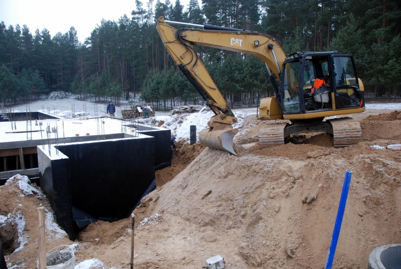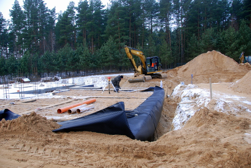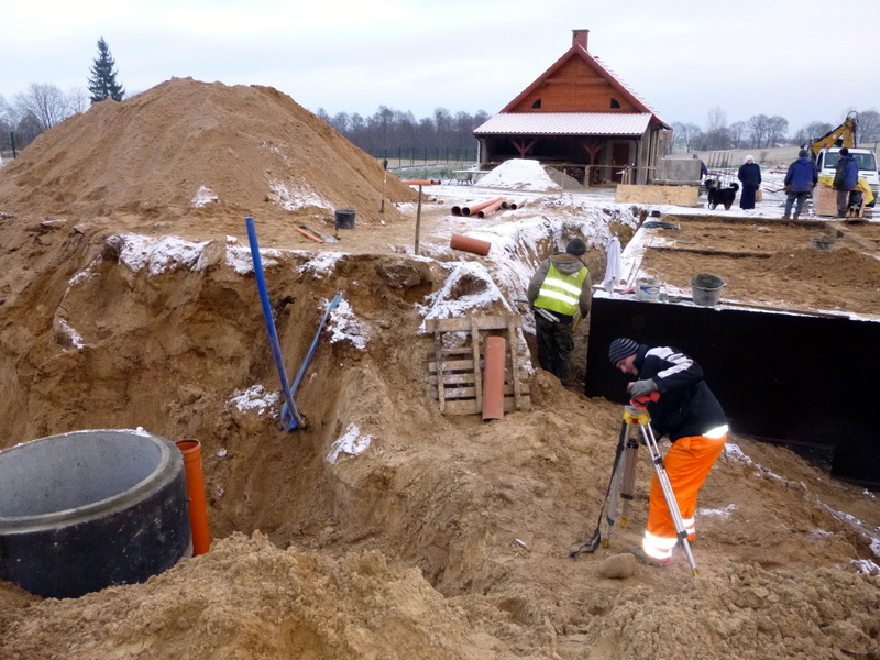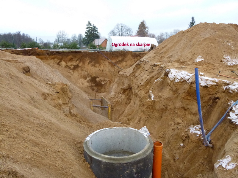 Udało się! Tuż przed pierwszym poważniejszym atakiem zimy zakończone zostały wszystkie prace przy fundamentach budynku i zewnętrzna sieć wodno-kanalizacyjna. Firma AQUAT wykonała ostanie studnie kanalizacyjne i przepompownię ścieków. Zbiornik przepompowni musiał zostać posadowiony w najniższym punkcie, czyli 5,80 m poniżej poziomu gruntu! To był naprawdę „taniec koparek”. Jakimś cudem ostał się na szczęście nasz mały ogródek, który w pewnym momencie znalazł się na brzegu 6-metrowej skarpy… Bardzo się cieszymy, że te prace udało się wykonać w tym roku. W przyszłym nie będzie już wielkich wykopów no i będziemy mogli myśleć o pełnym włączeniu się w gminną sieć wodociągowo-kanalizacyjną.