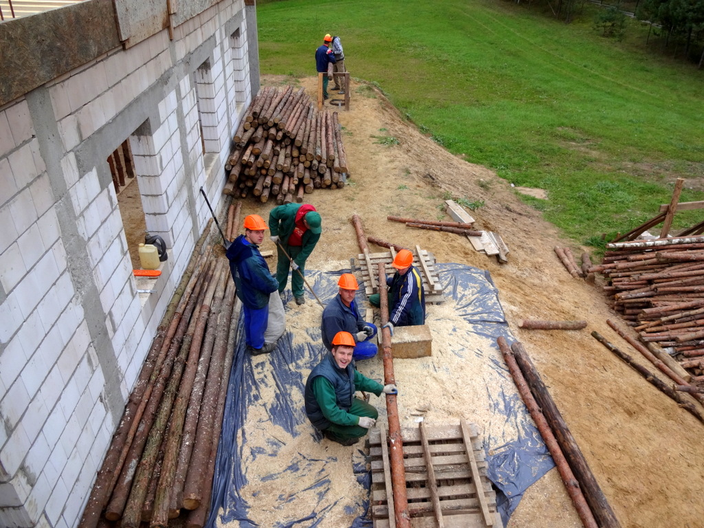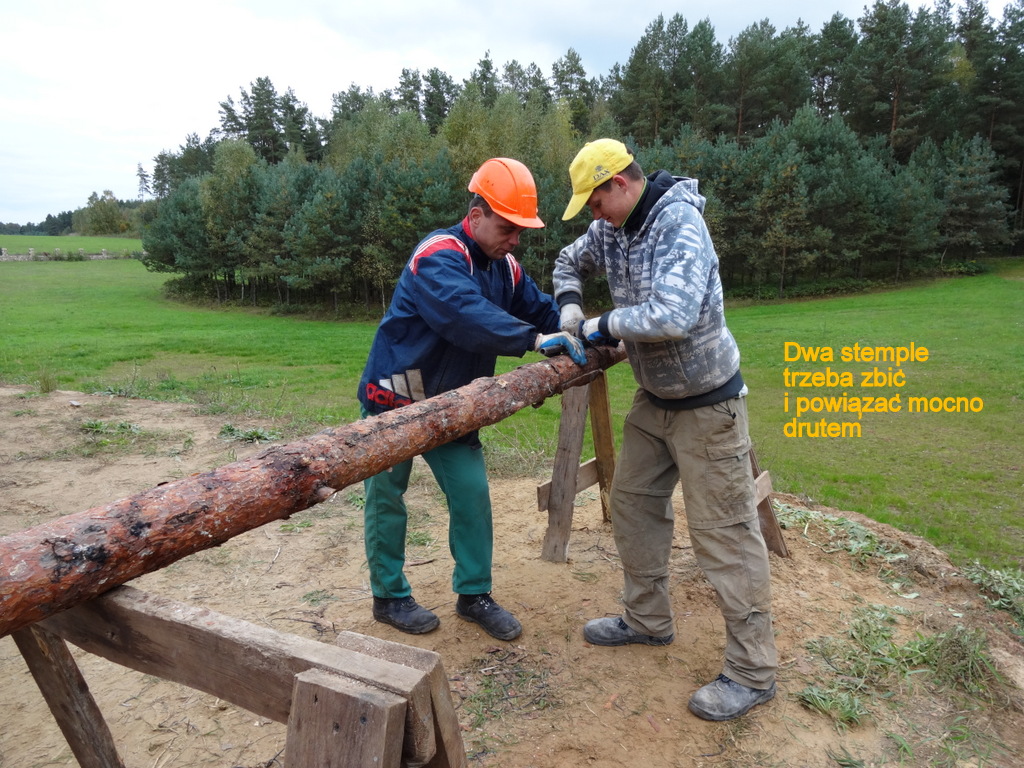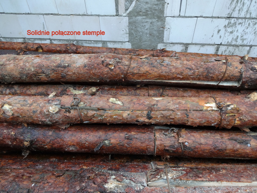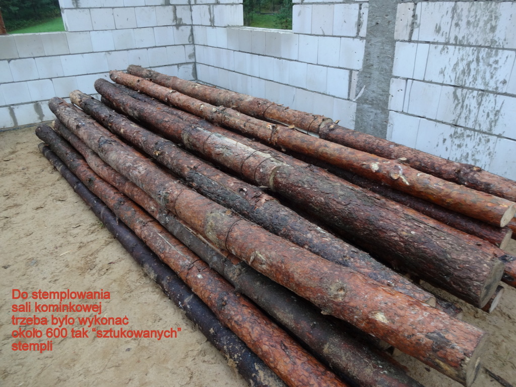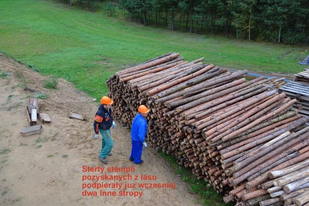 Duża sala kominkowa, najdłużej czekała na swój strop. Ponieważ jest wyższa od pozostałych pomieszczeń trzeba było przygotować dłuższe stemple. Te, które chłopcy pozyskali w lesie były już używane do stemplowania piwnicy i parteru. Teraz trzeba było pracowicie połączyć dwa w jeden dłuższy. I tak 600 razy, czyli 1200 połączonych stempli…