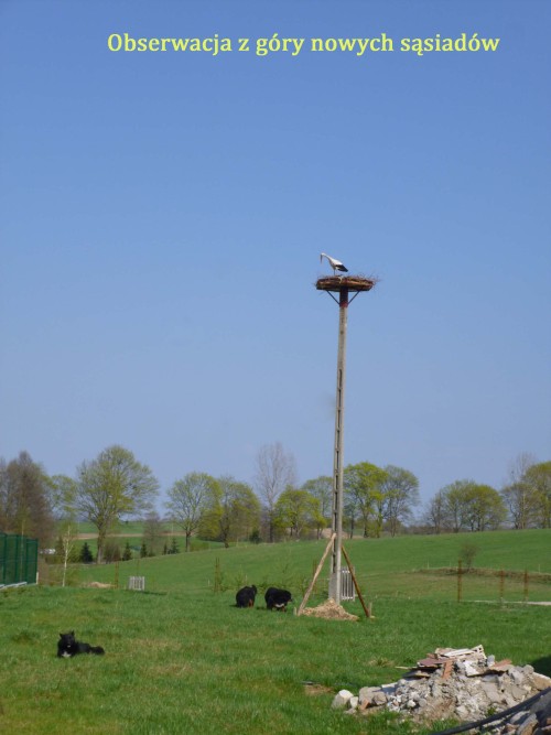 Bocianie gniazdo powoli jest urządzane i zapewne przygotowywane do zamieszkania już na drugi rok. Bociek codziennie odwiedza i przysiada na nim oglądając z góry okolicę. Czyżby pilnował już nowego lokum?